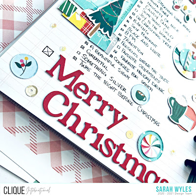 Usually I start out with my list and that's it, btu this past year I have been playing around a little more with how I do things. Why not dress it up and make it pretty? So I do that. I got the beautiful Holiday magic Seasonal kit and oh man was I looking forward to it! I love Pinkfresh Studio and this Christmas/Holiday collection was fantastic! I started by pulling some washi from my stash and running it across the top where I was going to put my title, then pulling the alphas from the kit and putting my title down. As you can see I started writing my list right down the left hand side of my page and then realized I didn't have to do that, I could lay a little with it if I wanted. So, I stopped what I was doing and started digging through the ephemer that came in the kit.